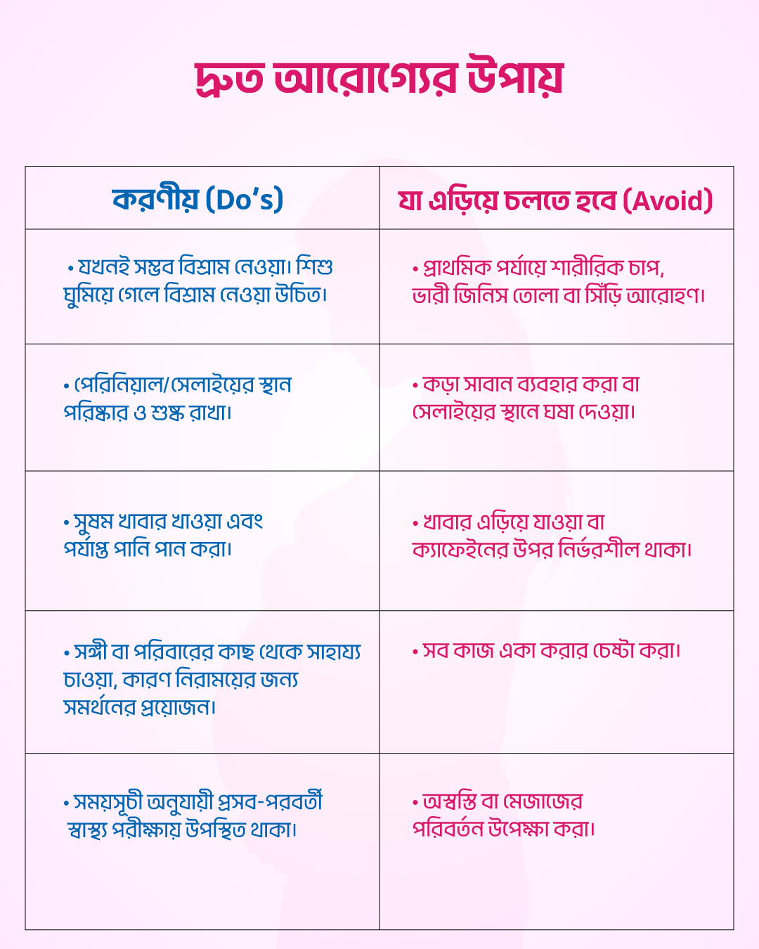 - প্রতিটি মায়ের আরোগ্য লাভের সময়কাল স্বতন্ত্র, তাই আপনার সময়কালকে অন্যের সাথে তুলনা করা যাবে না।
