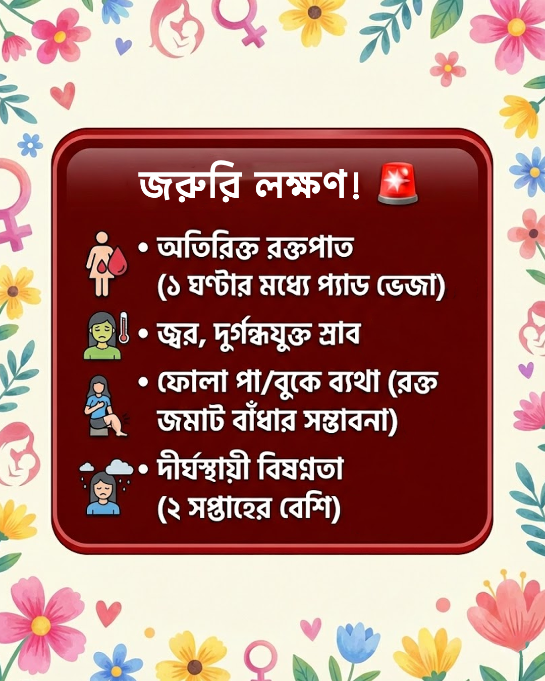 - লালচে ভাব, স্রাব বা ব্যথা বেড়ে যাওয়া (যা সংক্রমণের লক্ষণ হতে পারে)—এগুলোর দিকে খেয়াল রাখতে হবে।