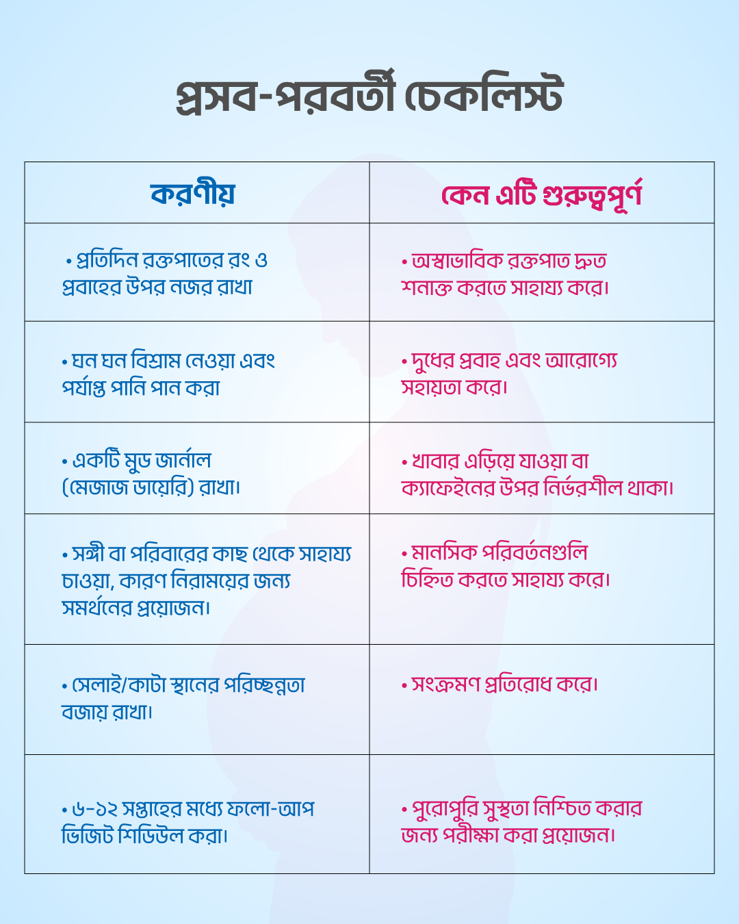 - প্রথম ৭২ ঘণ্টা: এই সময়ে জরায়ুর সংকোচন, অতিরিক্ত লোচিয়া (রক্তস্রাব), স্তনের প্রাথমিক পরিবর্তন এবং তীব্র ক্লান্তি অনুভূত হয় [১]।