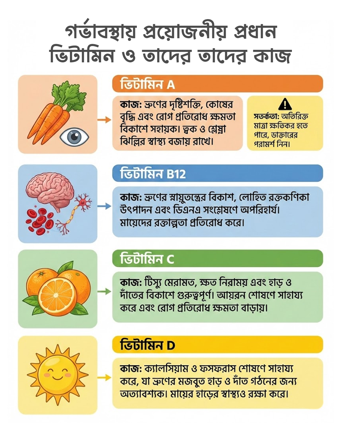 গর্ভাবস্থায় প্রয়োজনীয় প্রধান ভিটামিন ও তাদের তাদের কাজ সম্পর্কে আলোচনা করা হলো:
