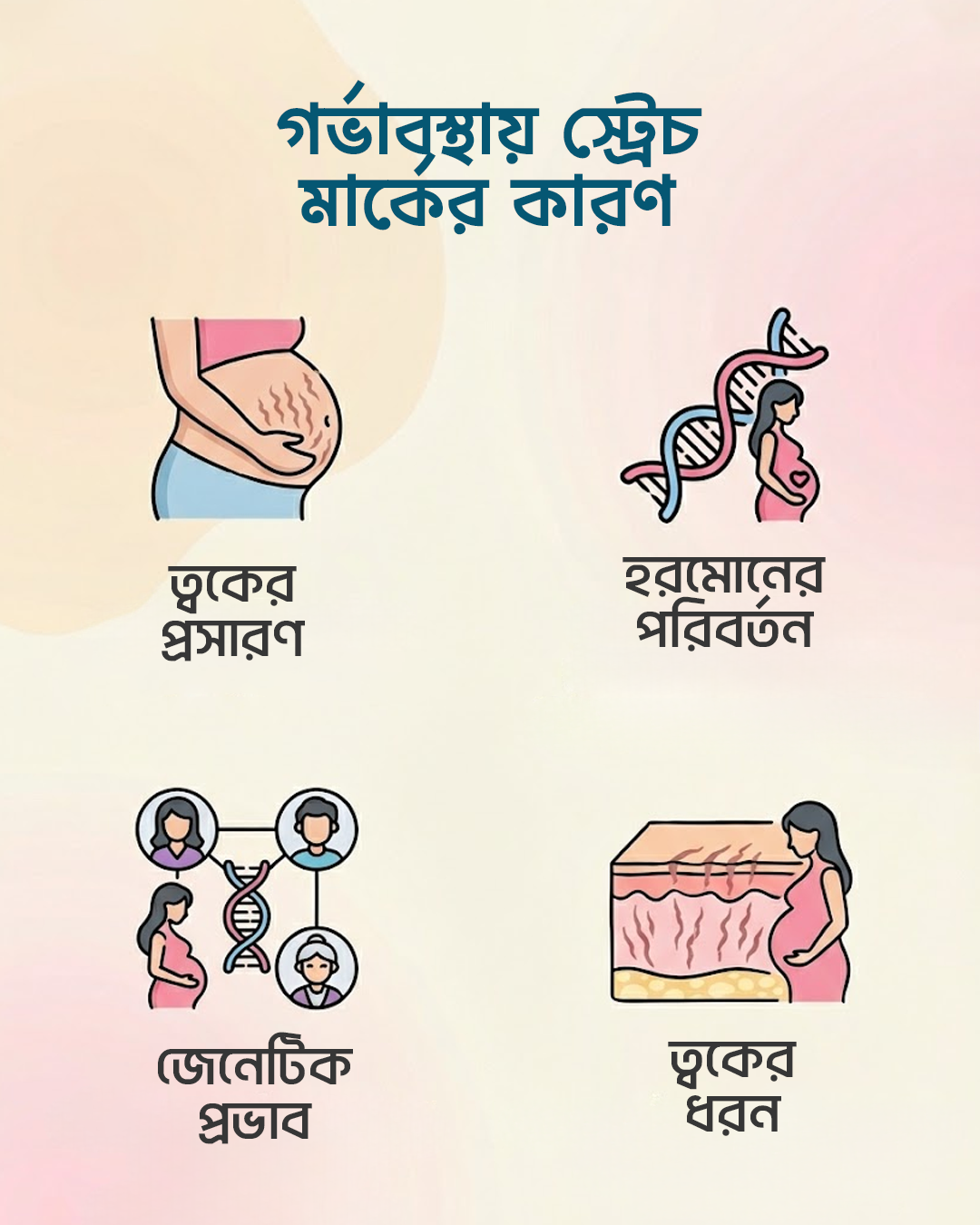 ত্বকের প্রসারণ: গর্ভাবস্থায় দ্রুত ওজন বৃদ্ধি এবং পেটের আকার বাড়ার কারণে ত্বক প্রসারিত হয়। ত্বক যখন খুব দ্রুত প্রসারিত হয়, তখন কোলাজেন এবং ইলাস্টিন ফাইবারগুলো দুর্বল হয়ে যায় এবং ফেটে যায়। ফলে স্ট্রেচ মার্ক দেখা যায়।২