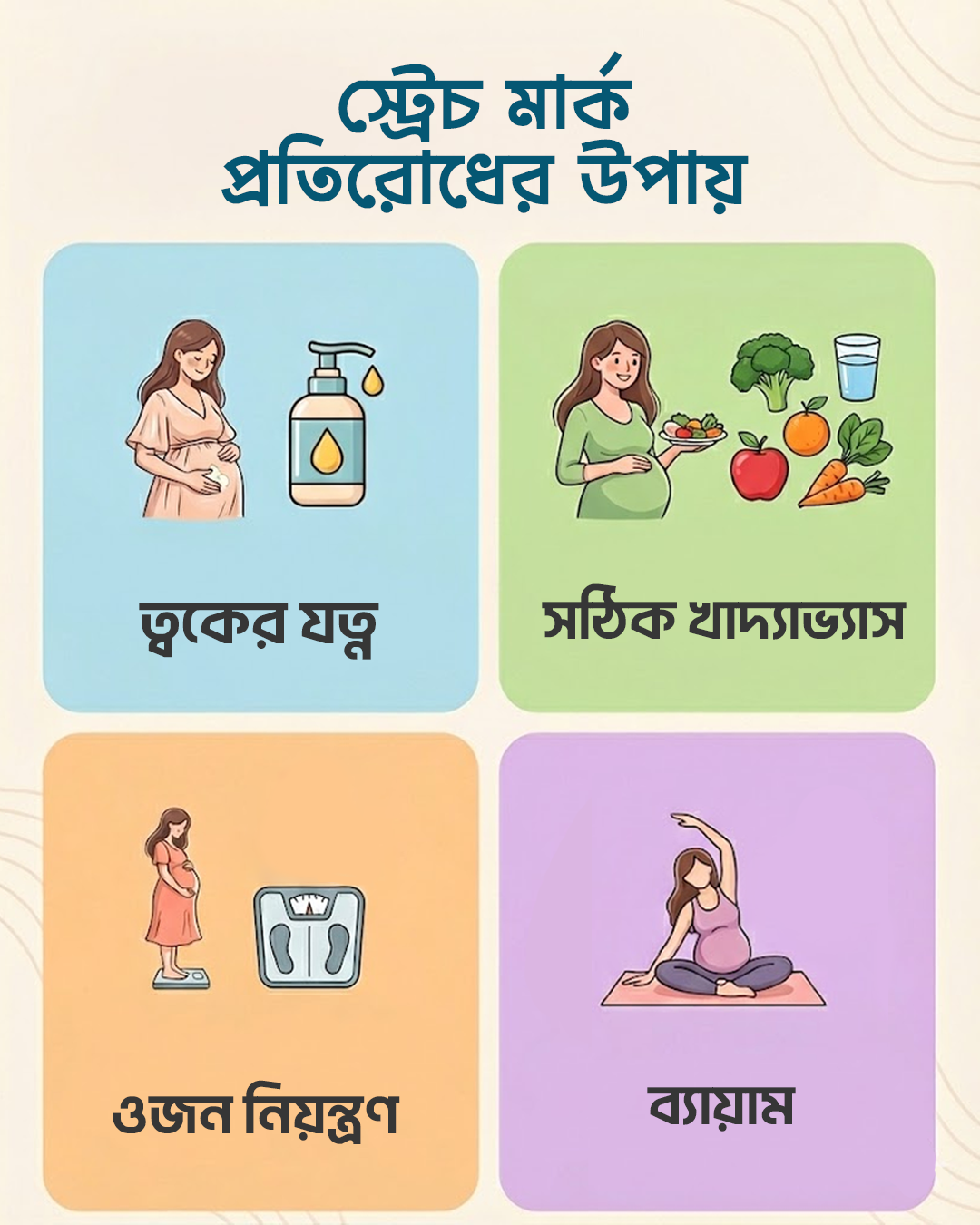 নিয়মিত ব্যায়াম: গর্ভাবস্থার জন্য নিরাপদ ব্যায়াম, যেমন - হাঁটা বা যোগা করুন। এগুলো ত্বকের স্থিতিস্থাপকতা বাড়াতে সাহায্য করে এবং রক্ত সঞ্চালন উন্নত করে।