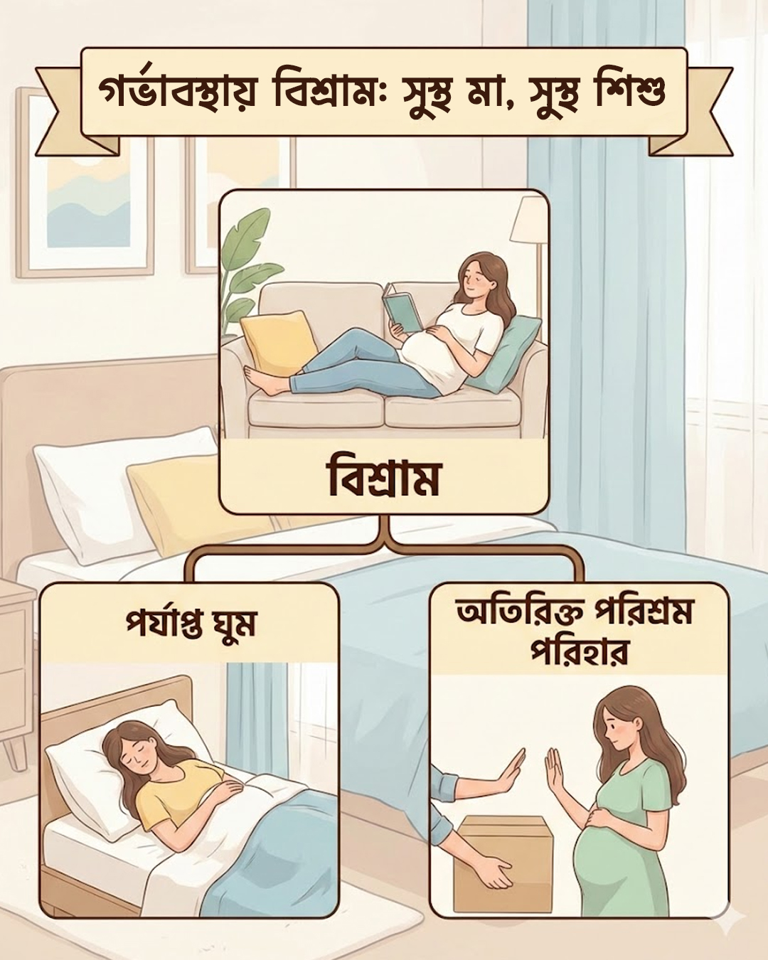শিশুর স্বাস্থ্য: মায়ের পর্যাপ্ত বিশ্রাম শিশুর সঠিক শারীরিক ও মানসিক বিকাশে সাহায্য করে। মায়ের শরীর ভালো থাকলে গর্ভের শিশুও সুস্থ থাকে। পর্যাপ্ত বিশ্রাম অকাল প্রসব এবং কম ওজনের শিশু জন্ম দেওয়ার ঝুঁকি কমায়, যা একটি সুস্থ শিশুর জন্ম নিশ্চিত করে। কিছু ক্ষেত্রে, পর্যাপ্ত বিশ্রাম অকাল প্রসব বা অন্যান্য জটিলতার ঝুঁকি কমাতে পারে।৪